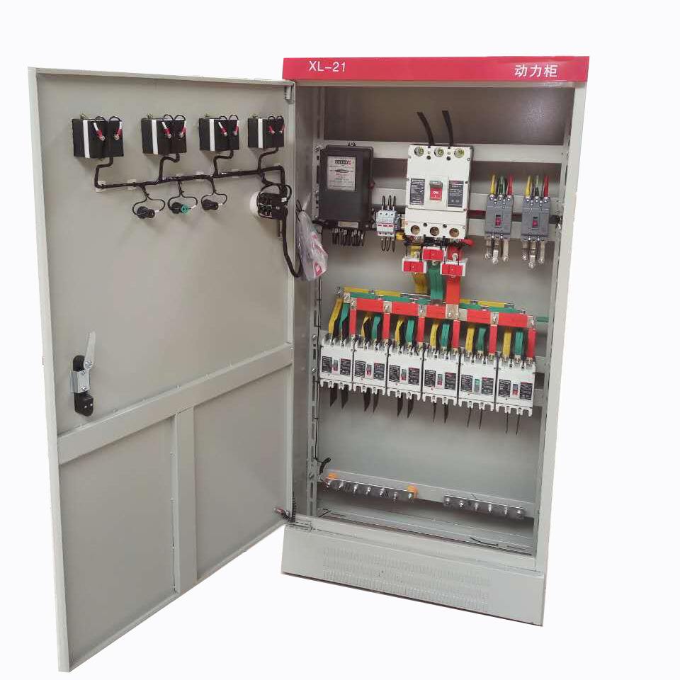 XL(F)-21型低压动力配电柜系户内靠墙安装,单面前开门的配电装置。其基本结构采用钢板弯制及角钢焊接而成。前右侧可装设刀开关操作手柄,作为电源切断与接通操作之用,箱门上可装设操作按钮,指示灯及显示仪表,打开箱后,配电箱内部设备全为敞露,便于检修维护。本配电箱装有空气断路器,熔断器作为短路保护外,还装有接触器和热继电器。门与壳体均焊有接地螺钉,..壳体与地连接可靠。